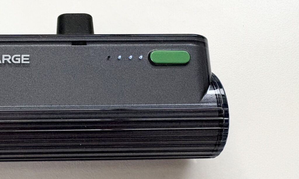 表面のボタンの横には4つのランプがあります。モバイルバッテリーの残容量に合わせて光るので、モバイルバッテリー本体の充電のタイミングもしっかり確認することができます(満タンだと4つすべてのランプが点きます)。